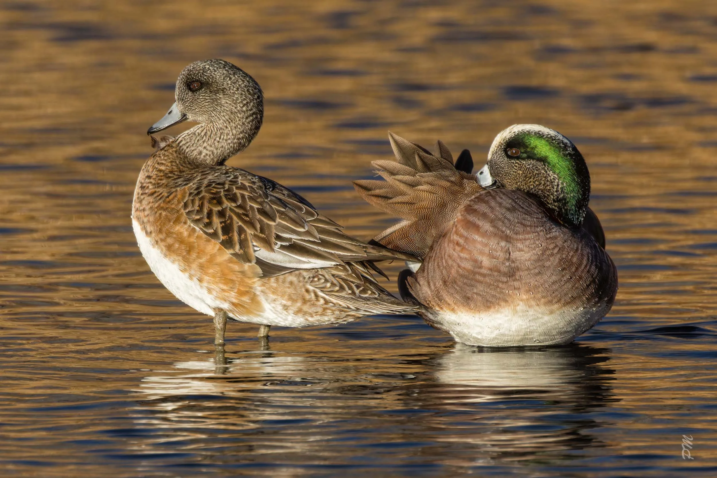 Right (Above on mobile device) - Pair of American Wigeons preening in the river