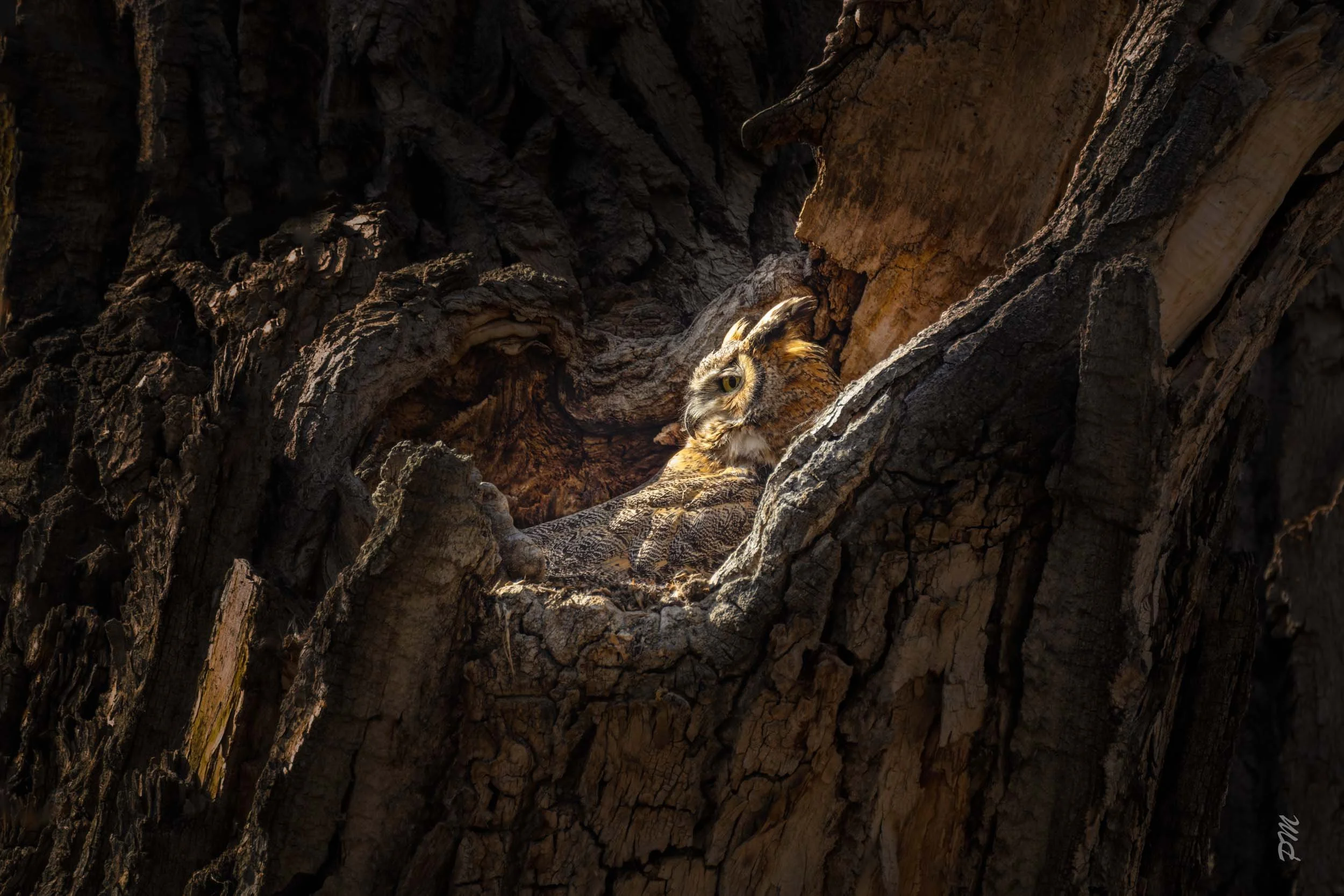 Above - Mama Great Horned Owl rests either before or right after her eggs hatch. The late afternoon light fell just perfectly on her. (Please note I practice ethical bird photography, especially around nests. This image appears substantially closer than it is due to the use of a 700mm lens and considerable cropping in post-processing. Other ethical practices I use can be found on my website)