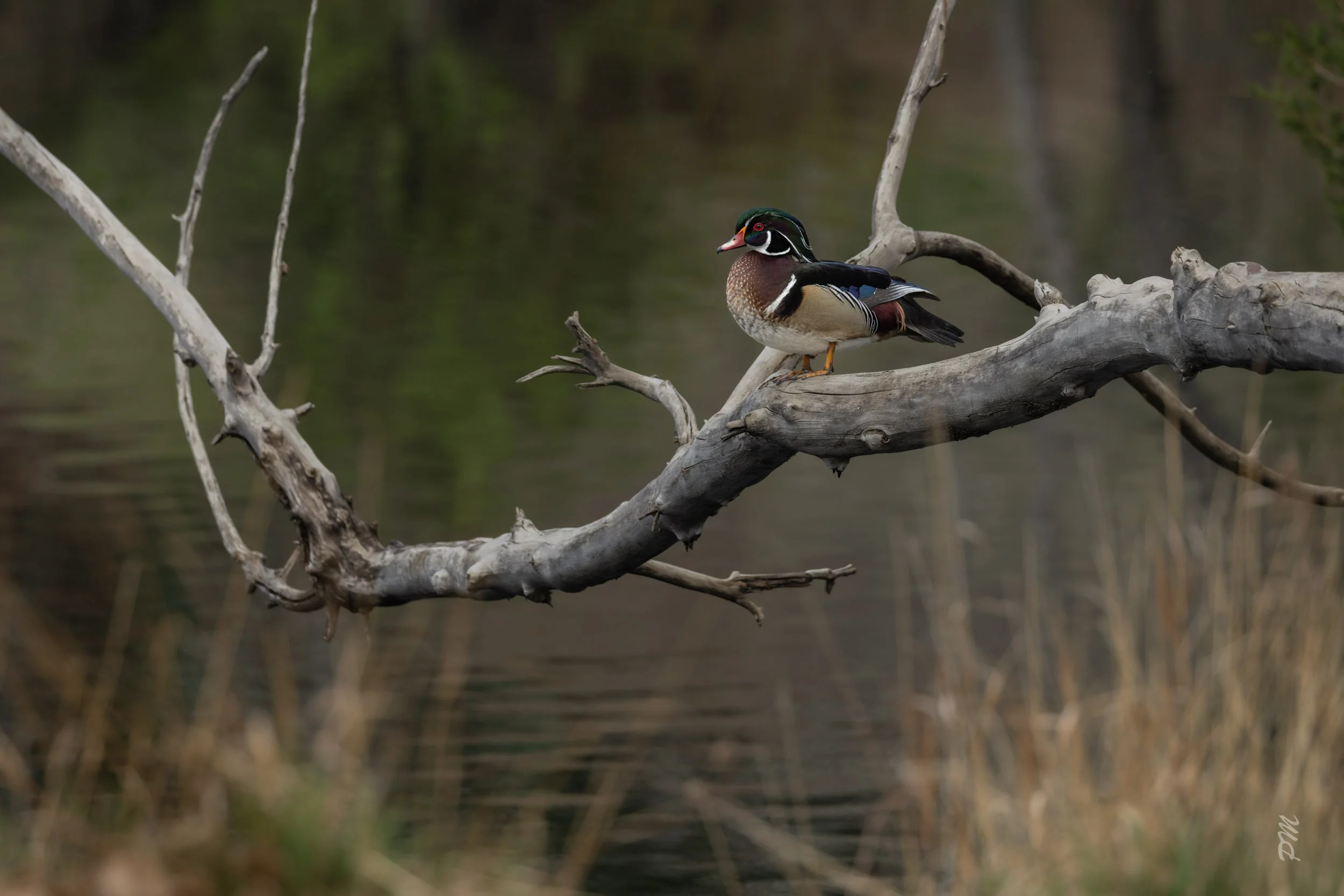 Above - A male Wood Duck rests on a large branch over a pond