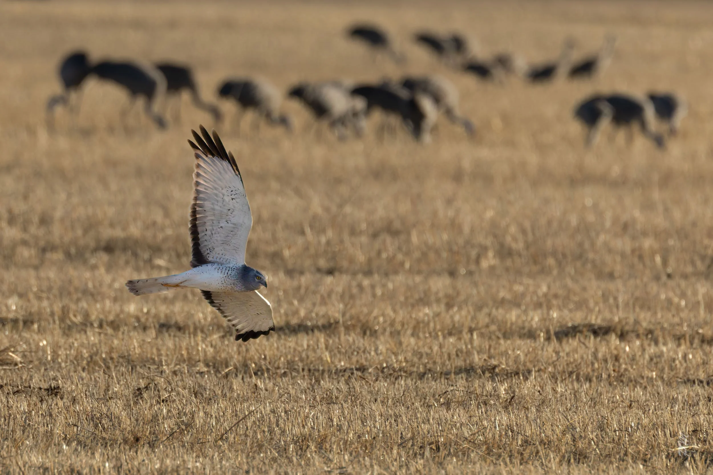 Above - Sandhill Cranes graze on grains in the background while a Northern Harrier patrols the same field more likely for small mammals like rodents