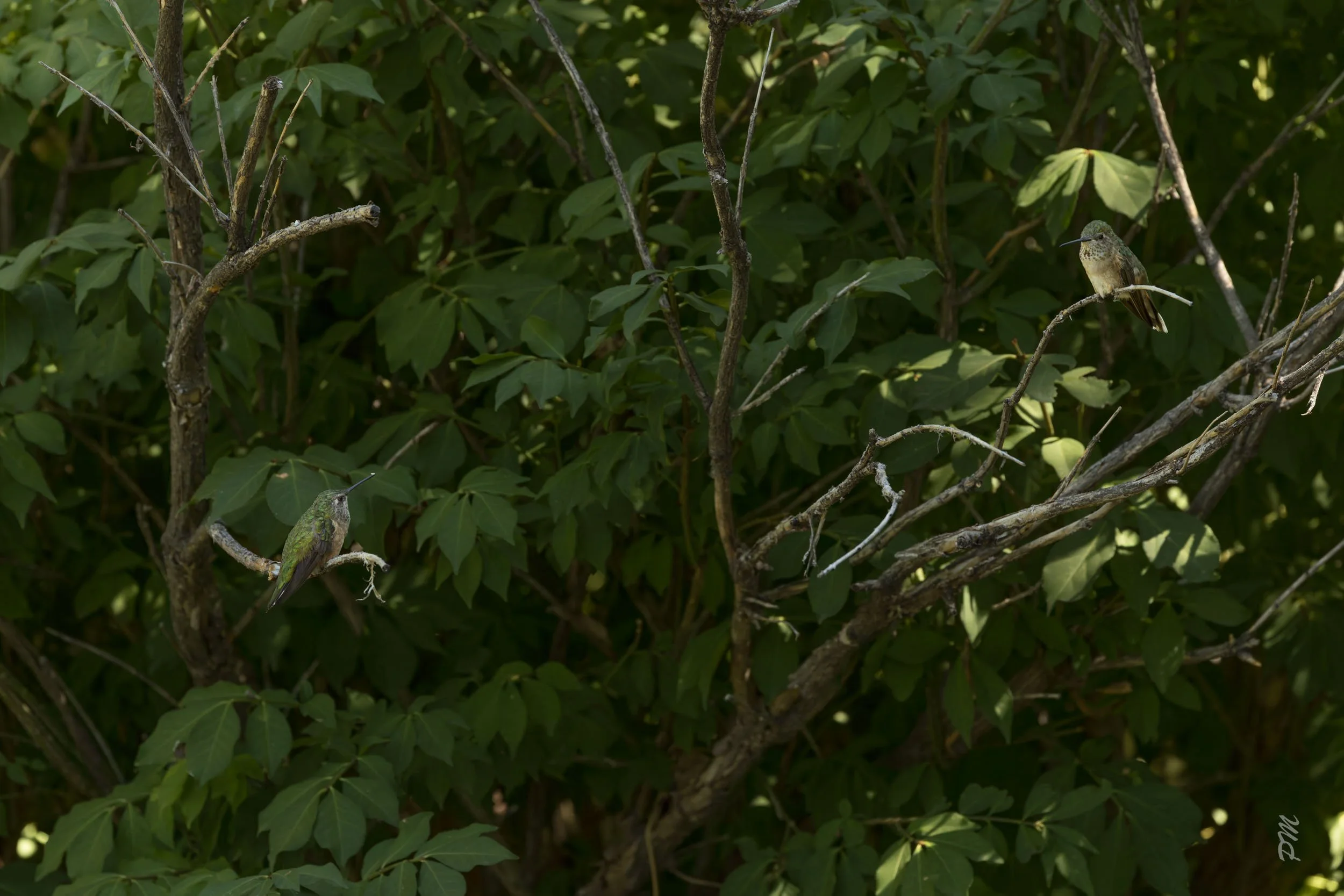 Above - One of the last photos I got of the new siblings this summer as they sit on nearby branches to each other. Note how the male in the upper right is already starting to get a recognizable gorget.